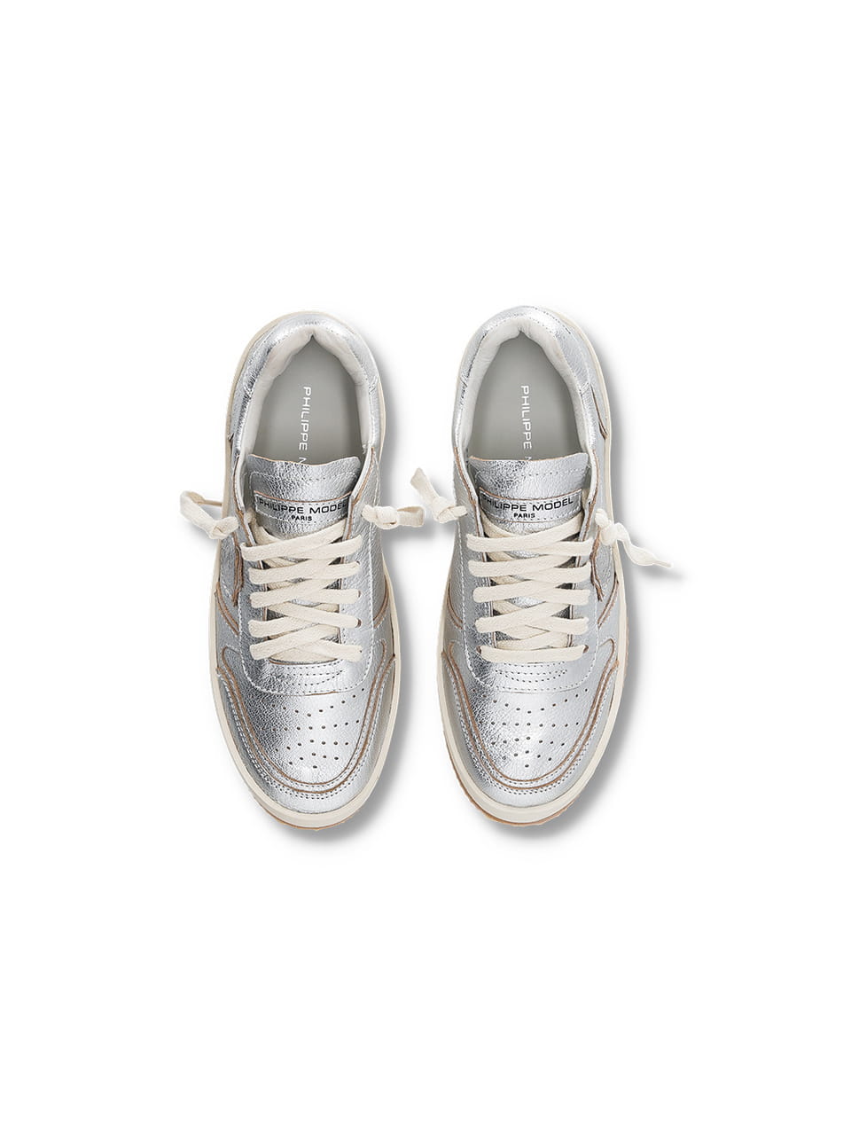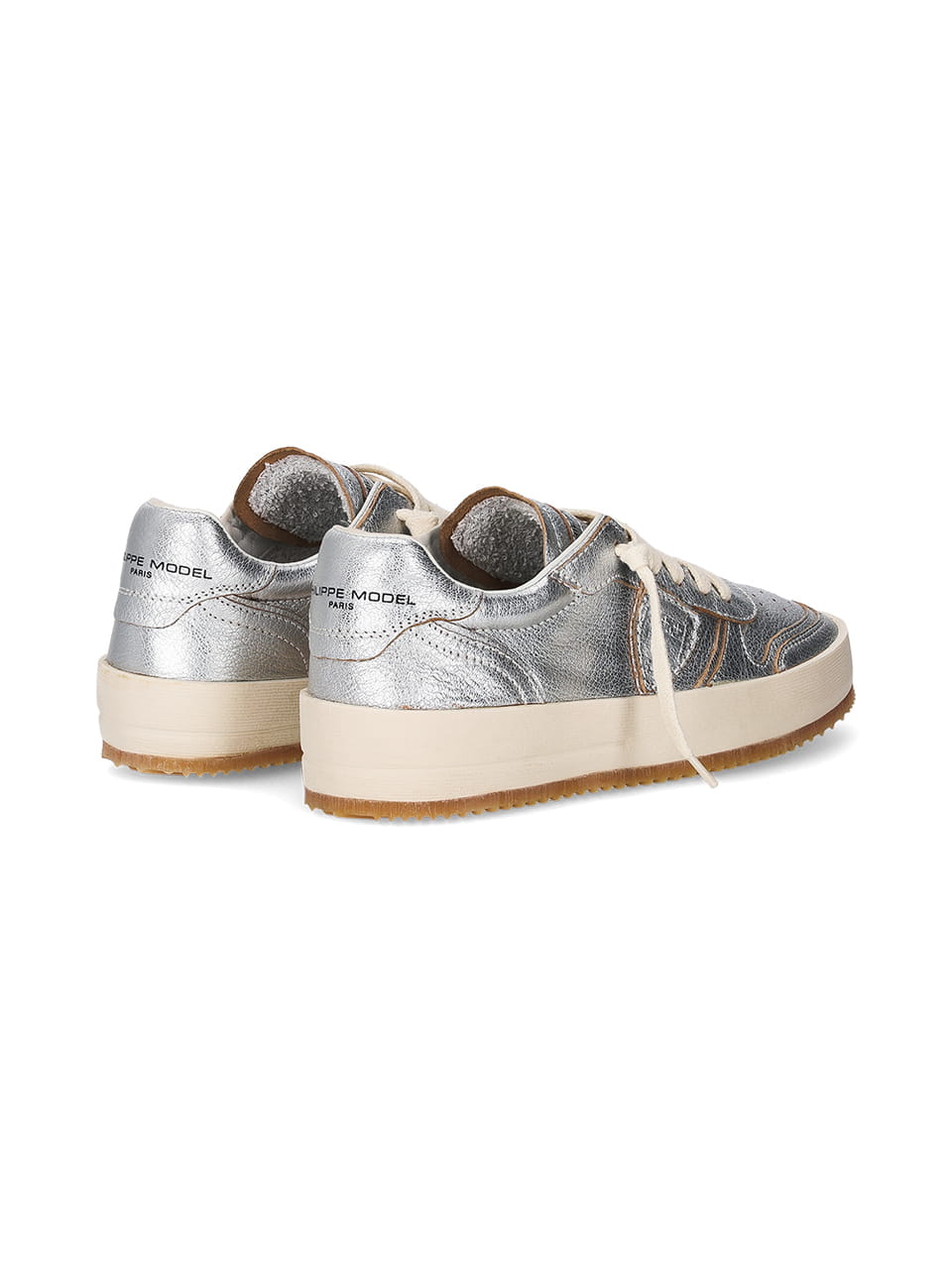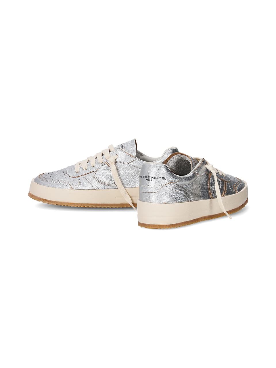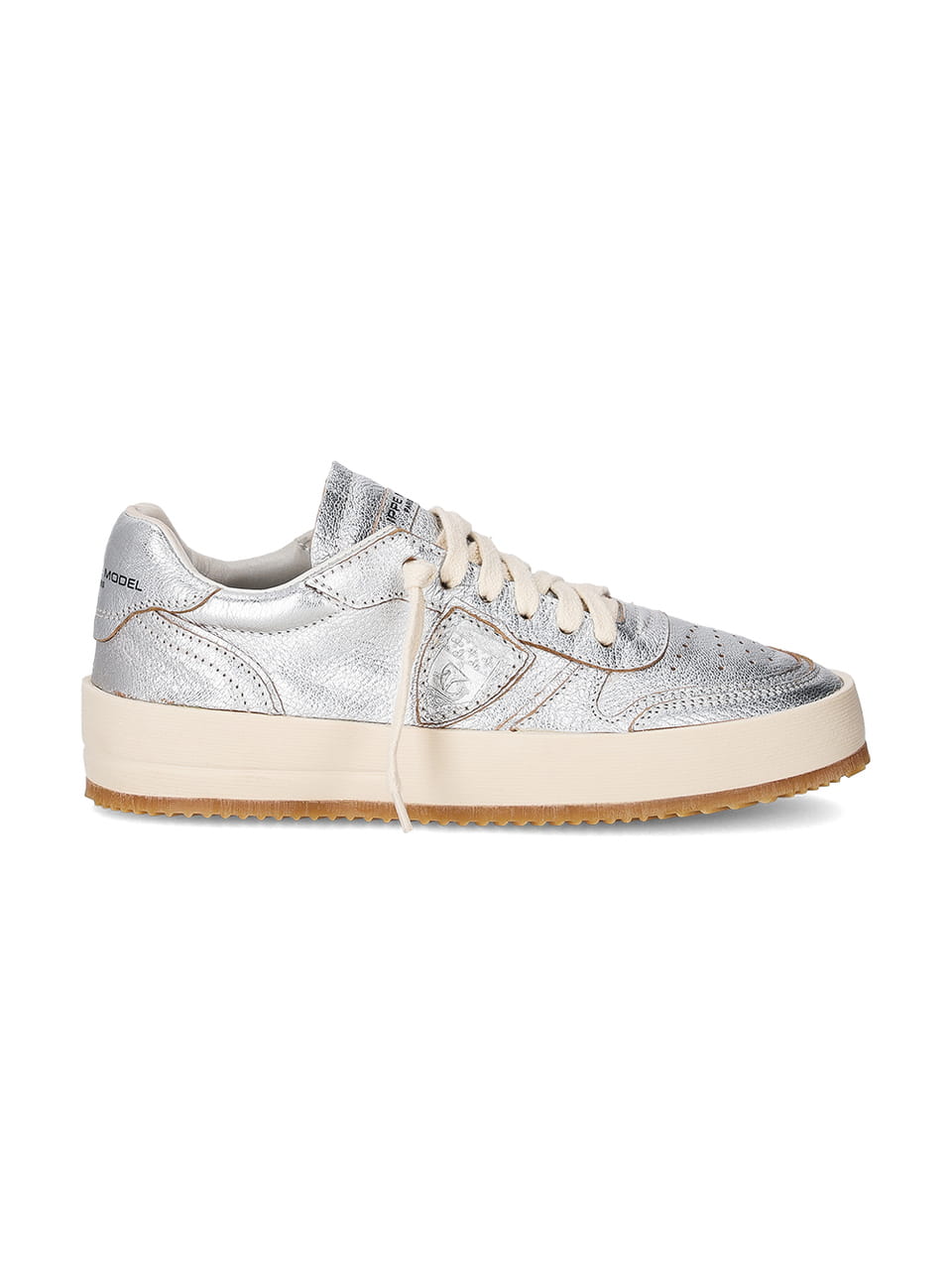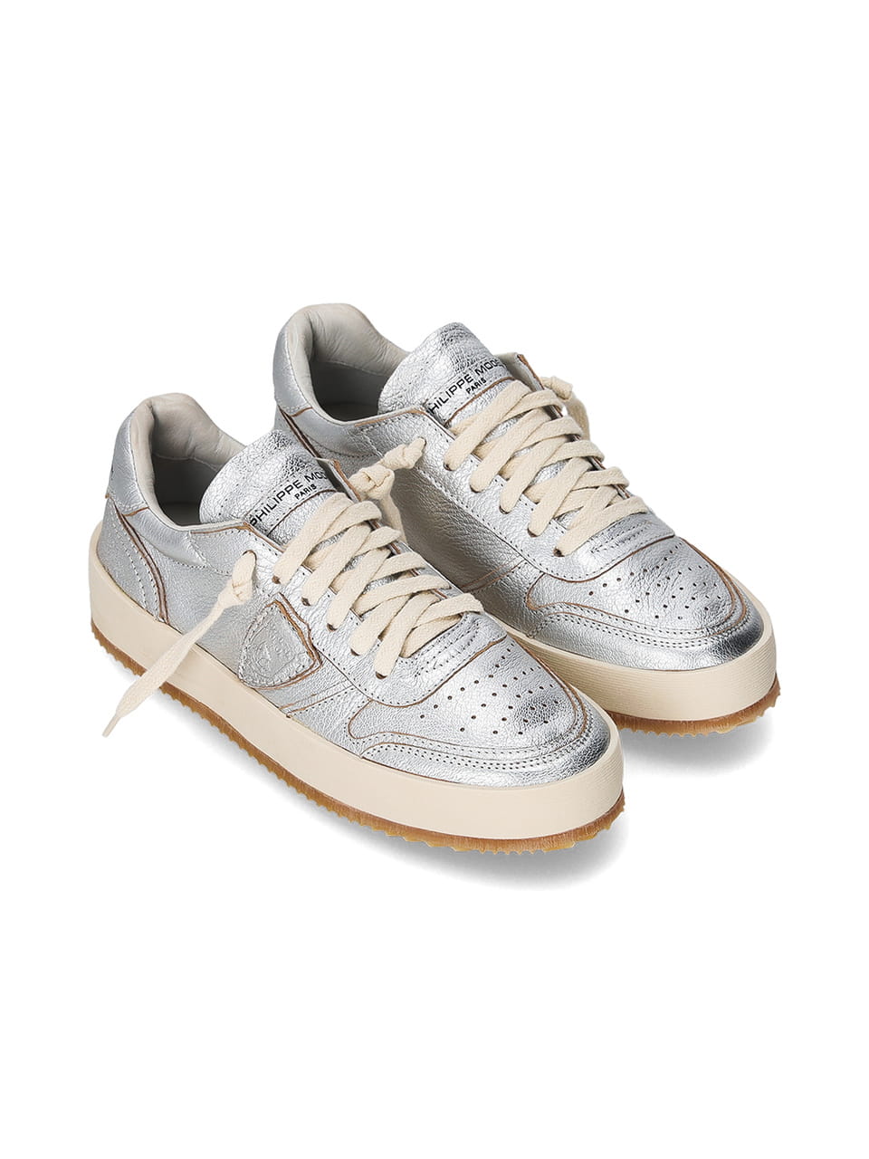 Modne akcenty w ulicznym designie. Buty Nice lśnią w dzień i stają się wspaniałe wieczorem dzięki cholewce ze skóry cielęcej laminowanej srebrem. Gumowa podeszwa z karbowanym paskiem dopełnia projekt.